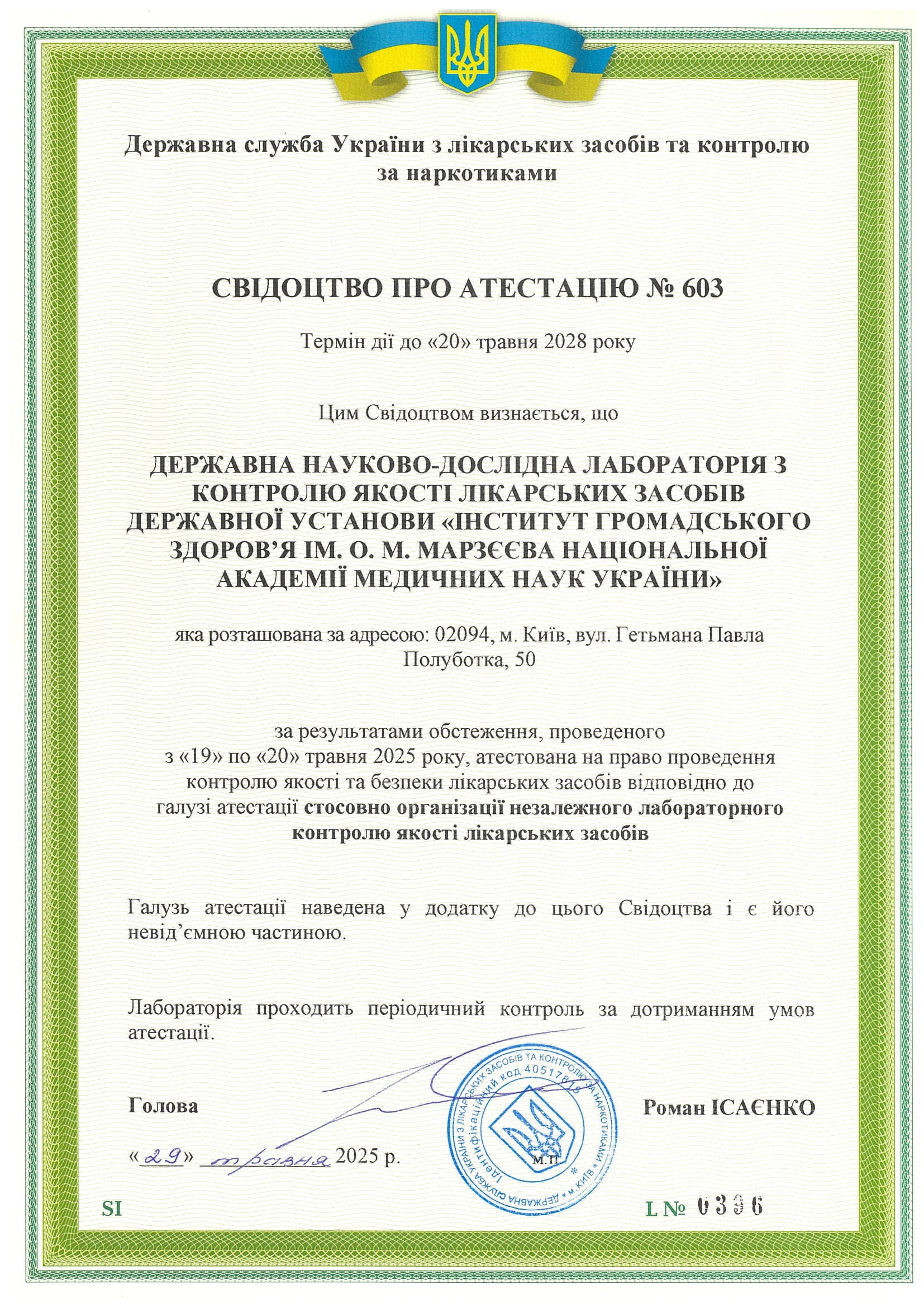 The laboratory is certified by the State Service of Ukraine for Drugs and Drug Control for the right to conduct quality control and safety of medicinal products in accordance with the field of certification, as attested by the Certificate of Attestation No. 603 of May 29, 2025.